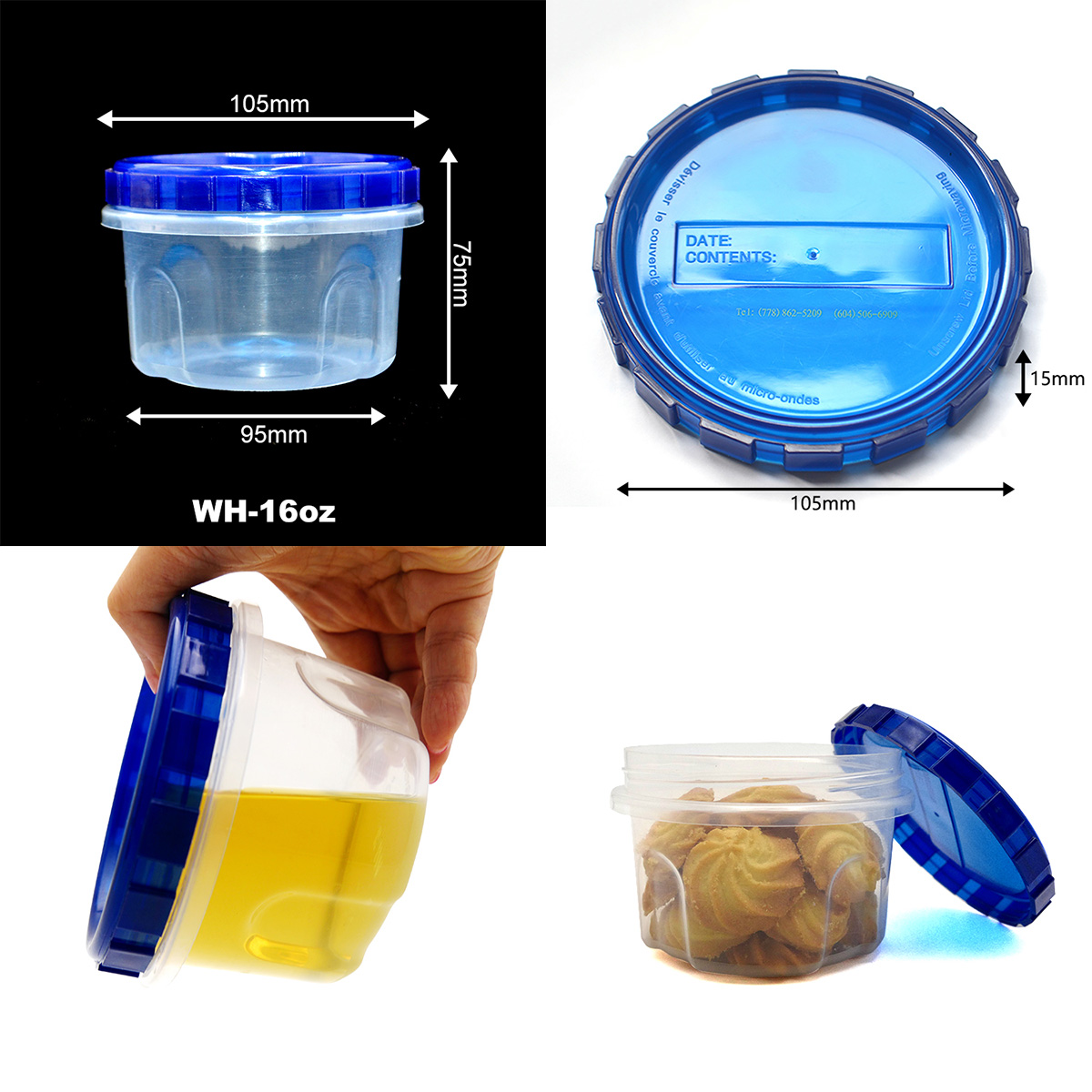 Größe und Fassungsvermögen: Dies ist die kleinere 16-Unzen-Größe unserer wiederverwendbaren Lebensmittelbehälter aus Kunststoff mit Drehdeckel.