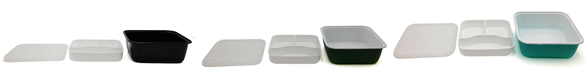 Verpackung | Polybeutel innen, Karton außen. (10 Sätze/Beutel, 2 Beutel/Karton. 20 Deckel + 20 Tabletts + 20 Innentabletts pro Karton) |