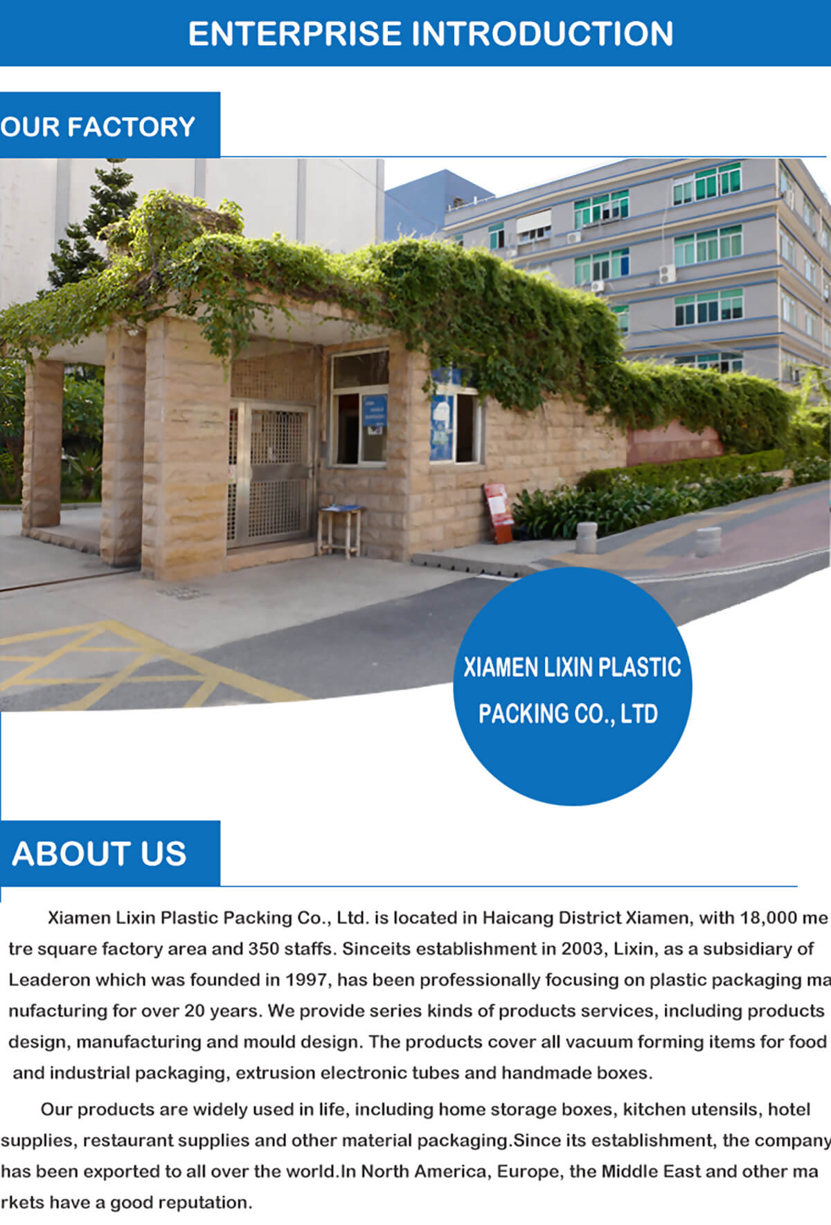 Als führendes Unternehmen im Bereich Kunststoffverpackungen ist Xiamen Lixin Plastic Packing Co., Ltd.hat es sich zur Aufgabe gemacht, seinen Kunden hochwertige und innovative Verpackungslösungen anzubieten.Unsere Produkte werden häufig in Lebensmittelverpackungen, elektronischen Verpackungen, Industrieverpackungen und vielen anderen Bereichen eingesetzt