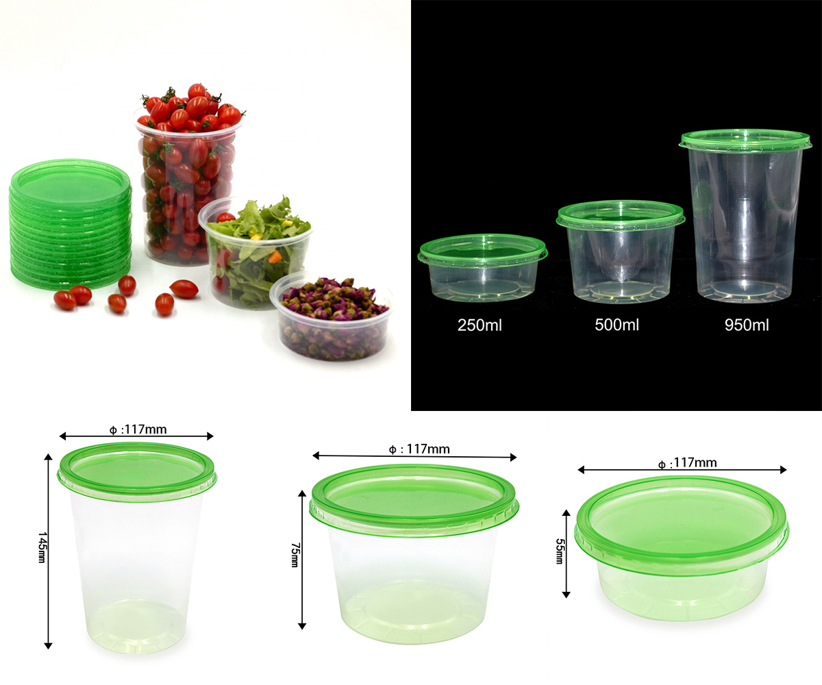 Abmessungen | 250 ml: Φ: 117 mm H: 55 mm 500 ml: Φ: 117 mm H: 75 mm 950 ml: Φ: 117 mm H: 145 mm Deckel: Φ: 117 mm H: 5 mm |